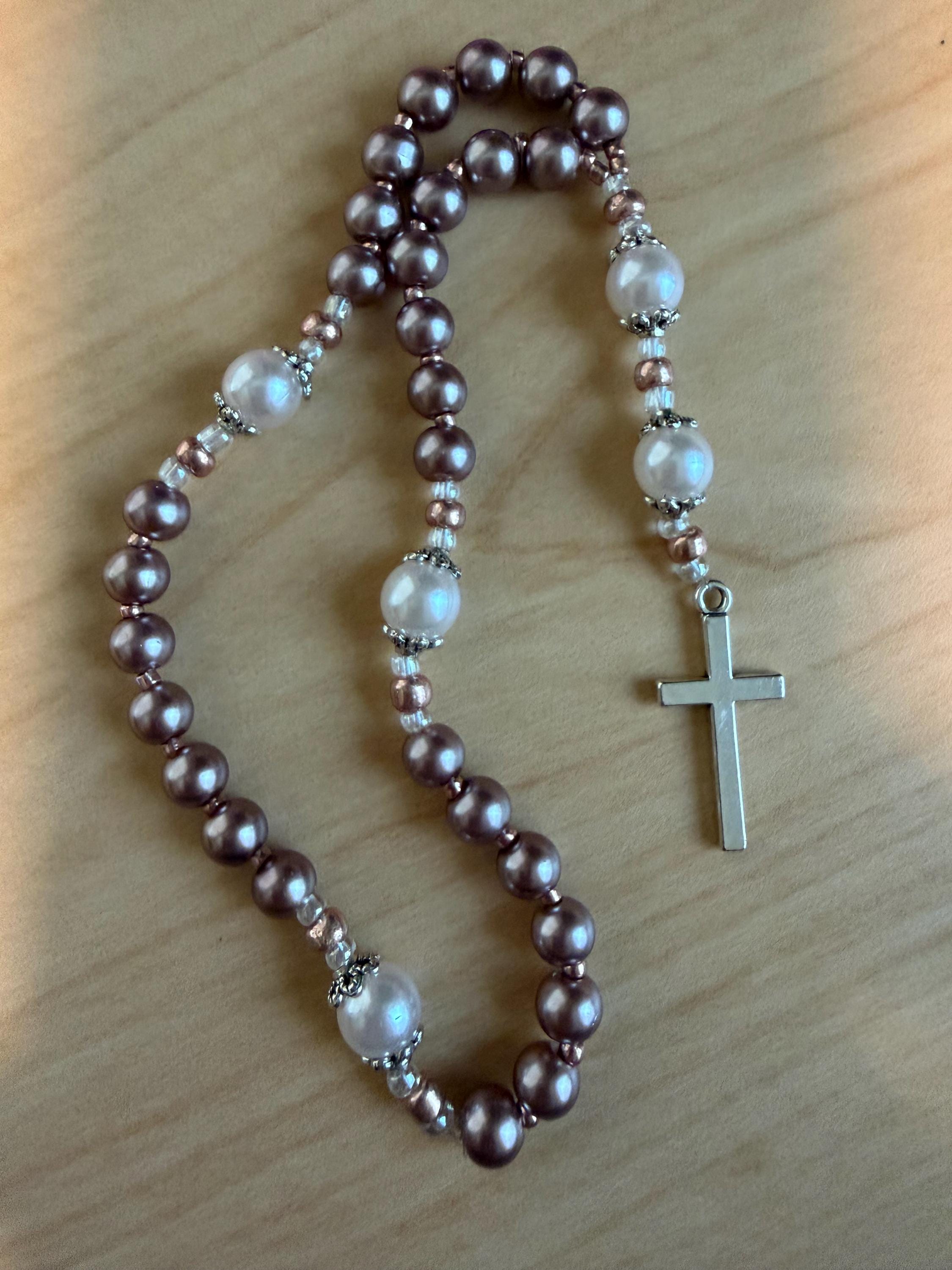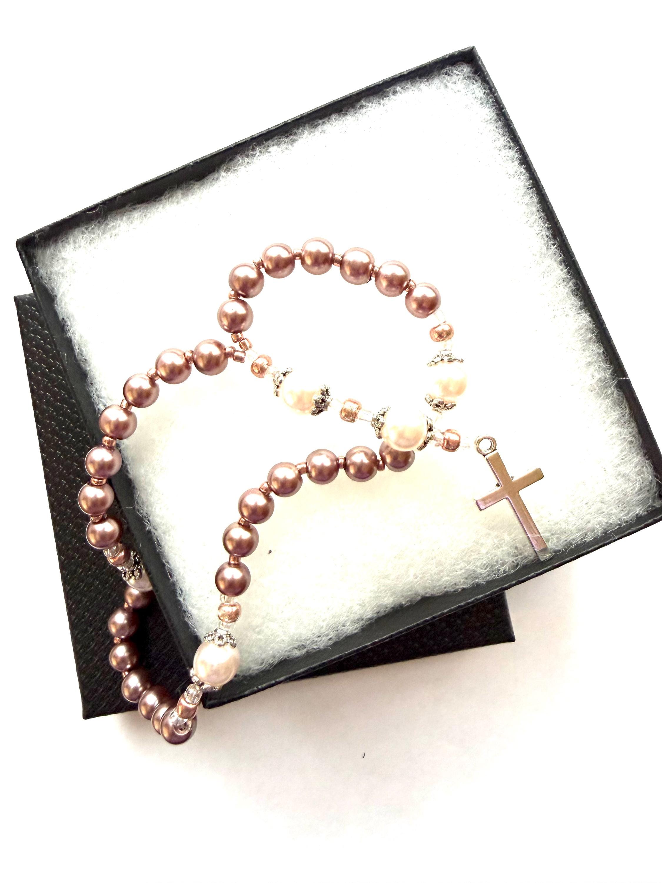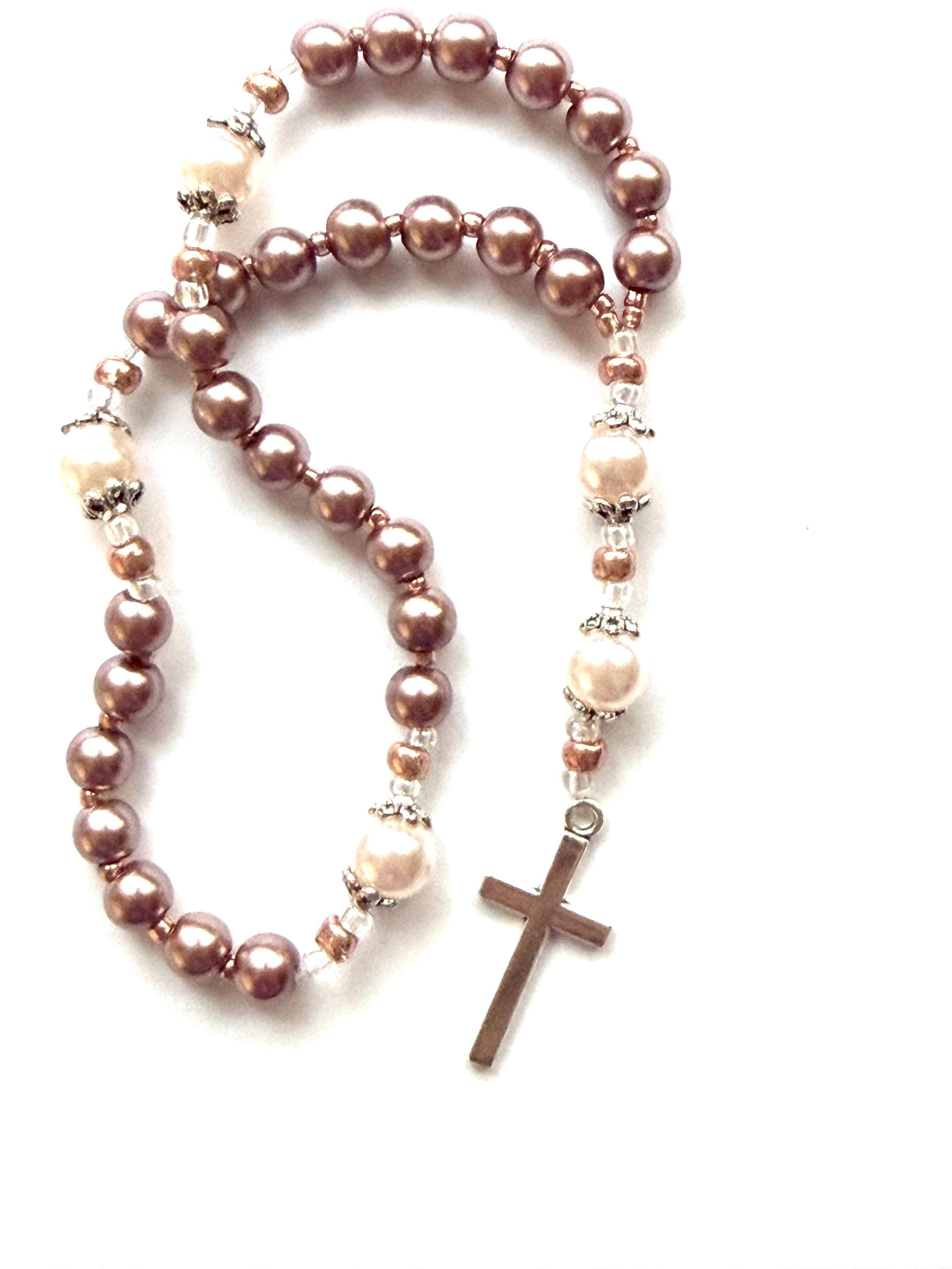 Each rosary is carefully assembled by hand with attention to detail, creating a piece that feels both personal and refined. The soft antique rose bead color adds a vintage-inspired look, while the silver and rose gold accents and simple cross give it a classic, reverent finish.