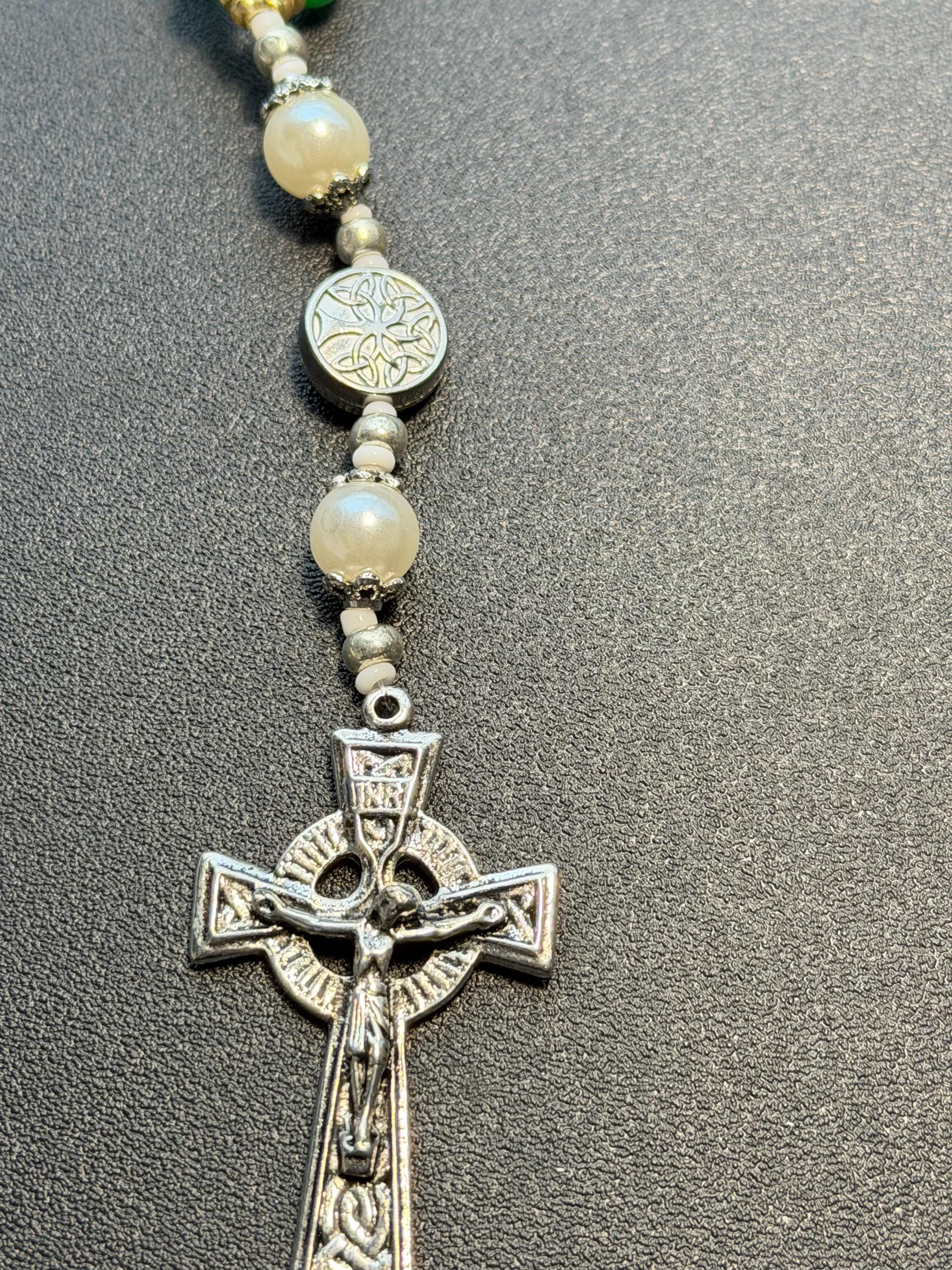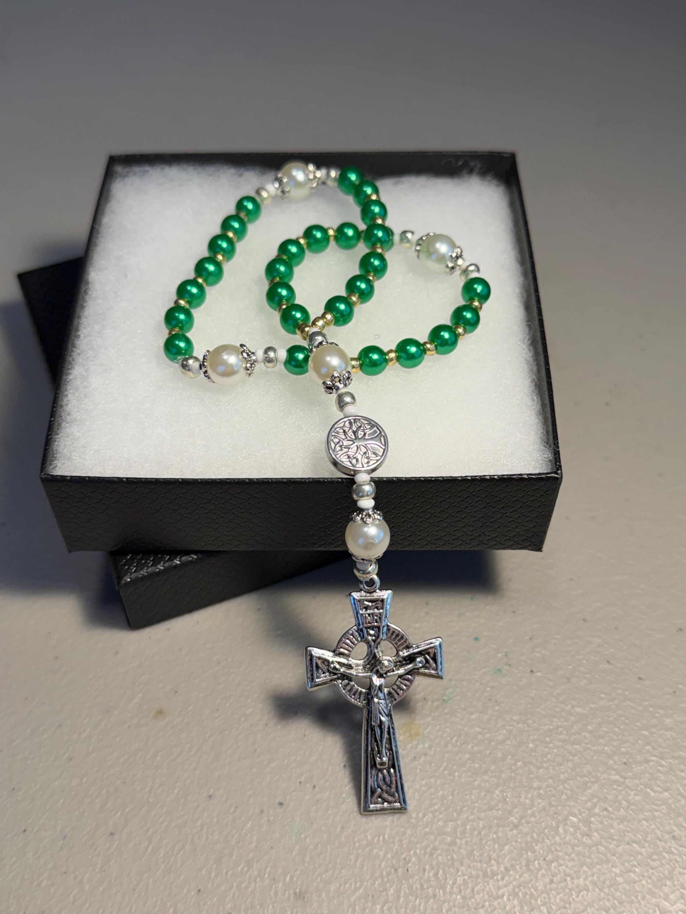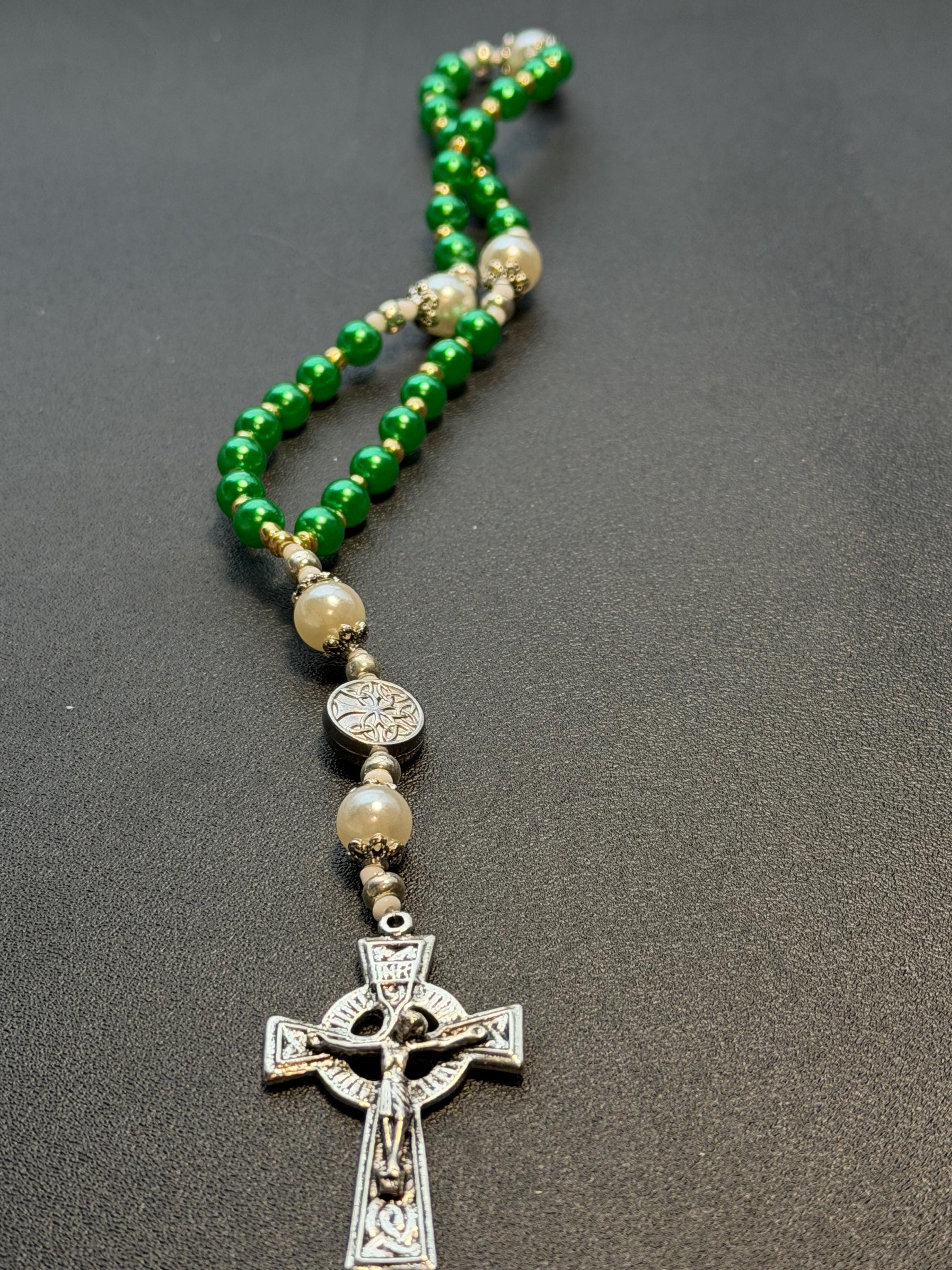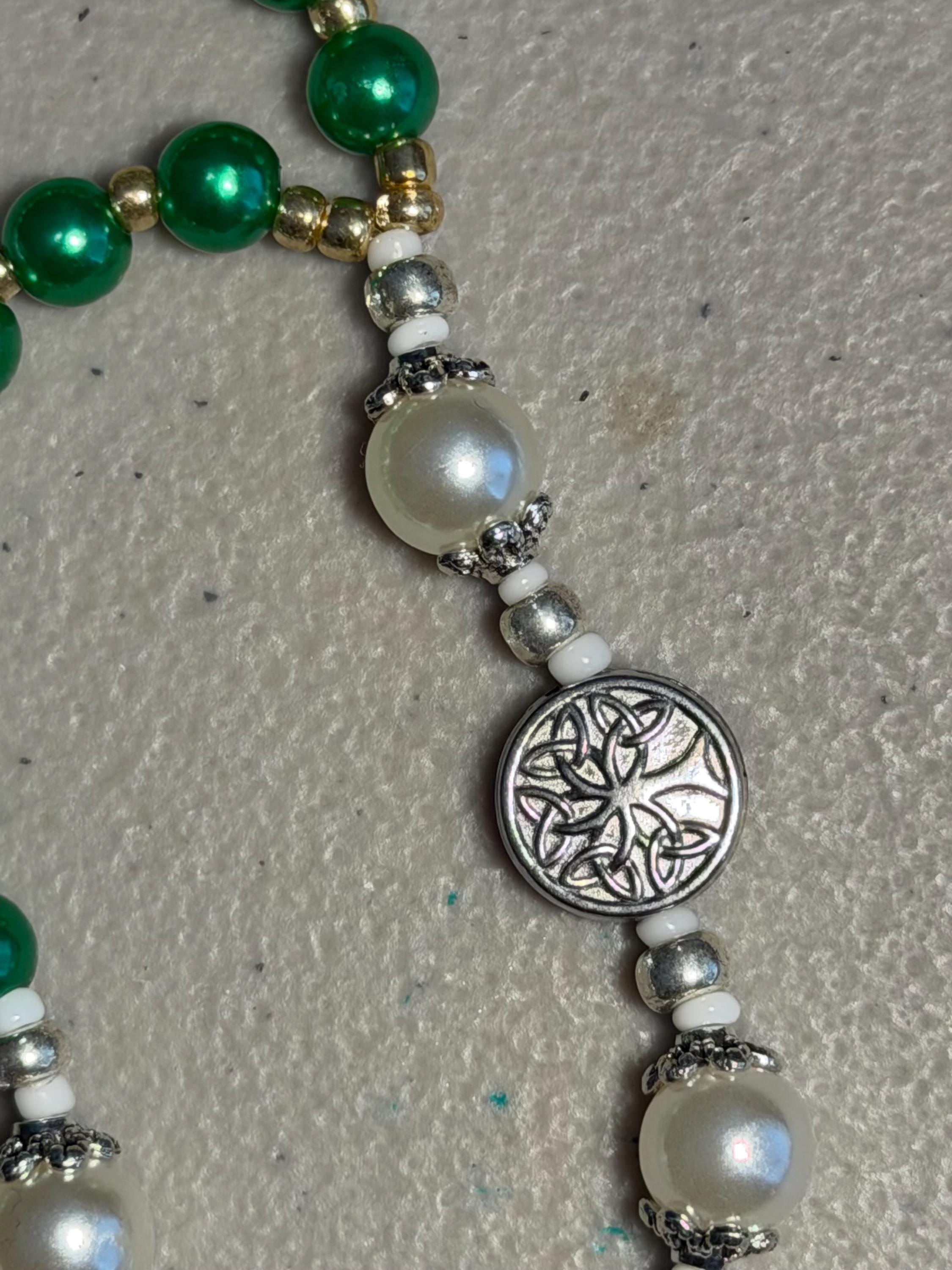 This handmade Celtic Anglican rosary features vibrant green beads, gold and silver accents, luminous pearl-style details, and an ornate silver-tone cross and a tree of life bead for added Celtic flavor. Crafted with care, this rosary is a beautiful devotional piece for prayer, meditation, or gift-giving.