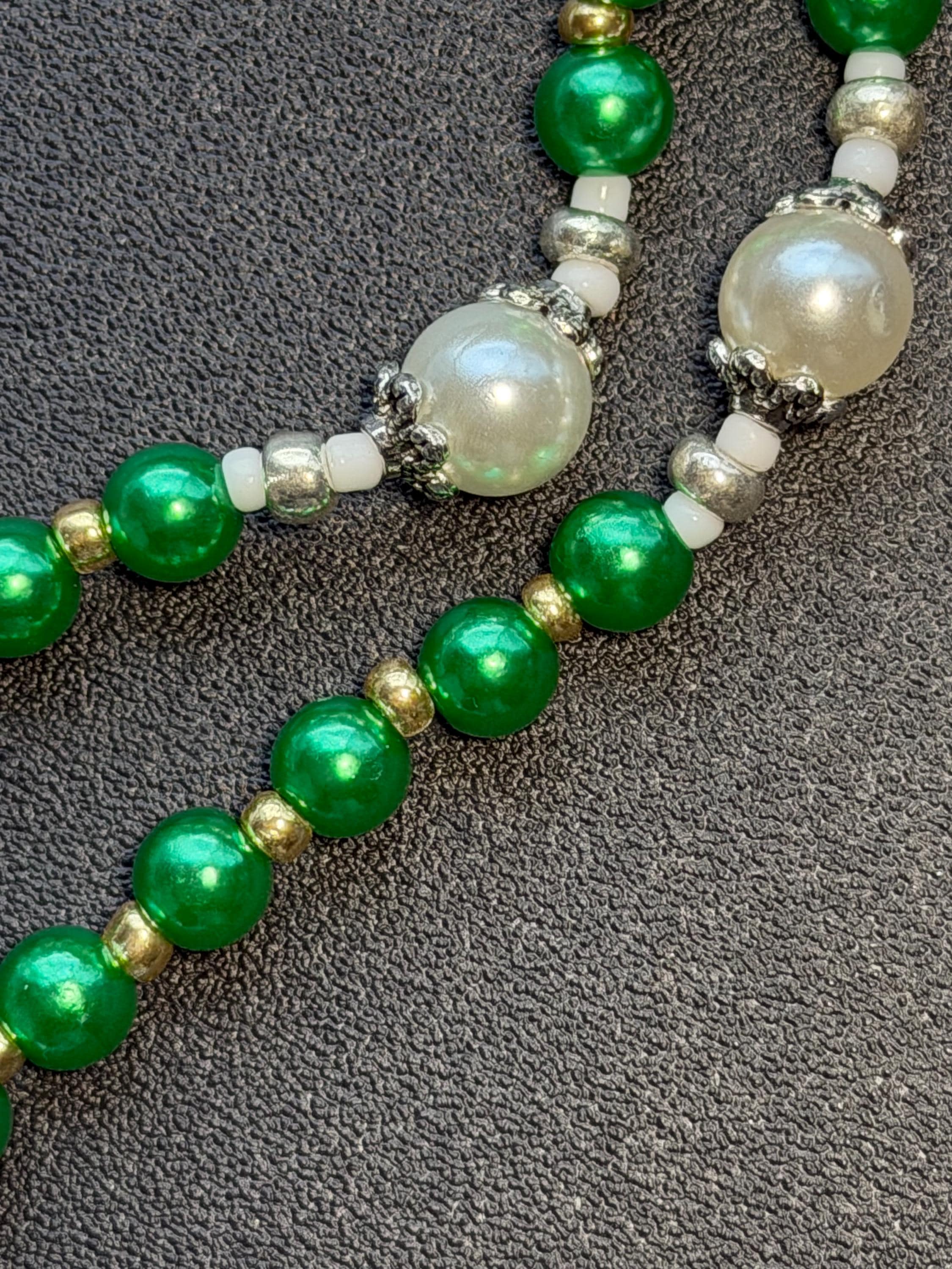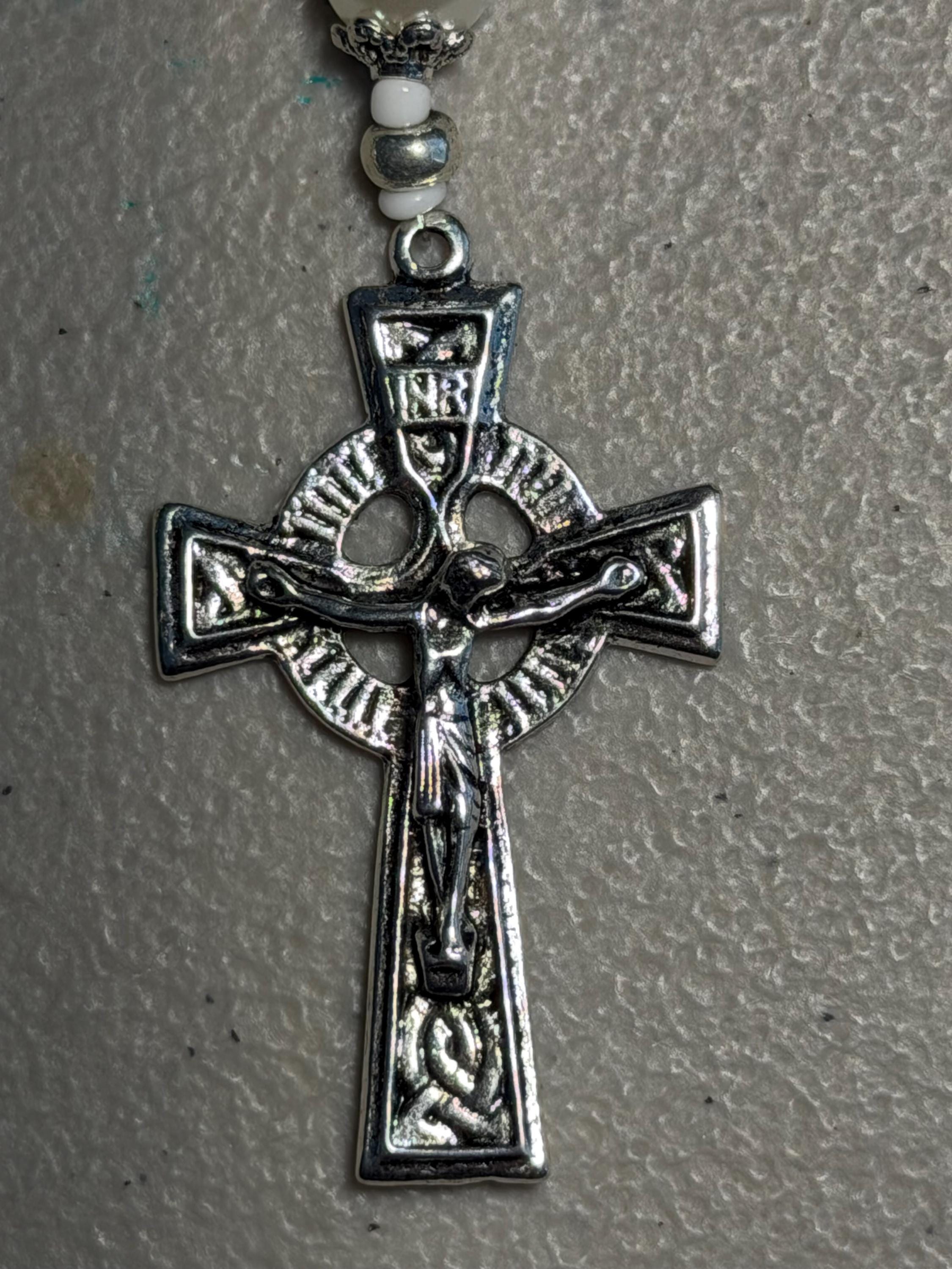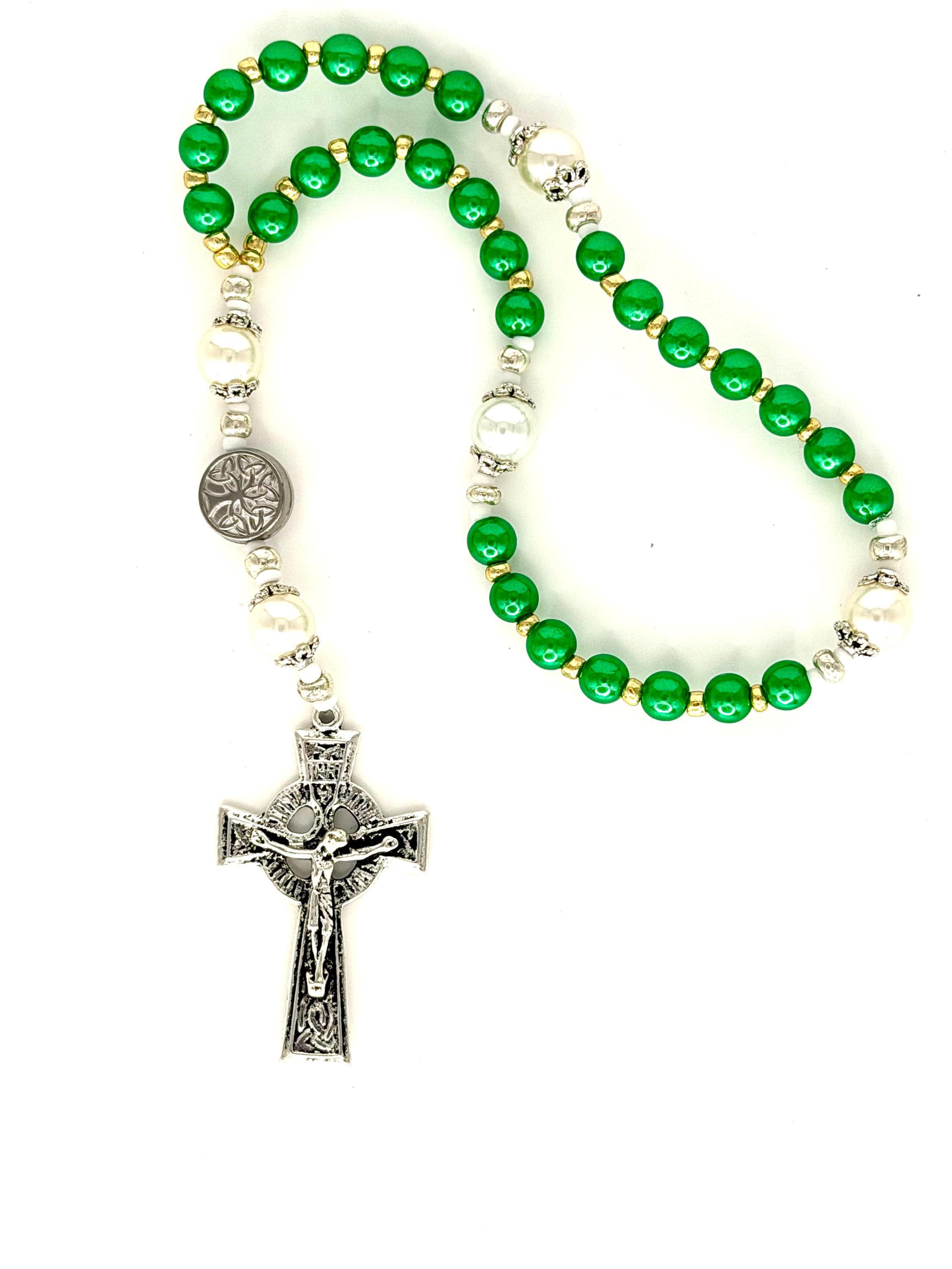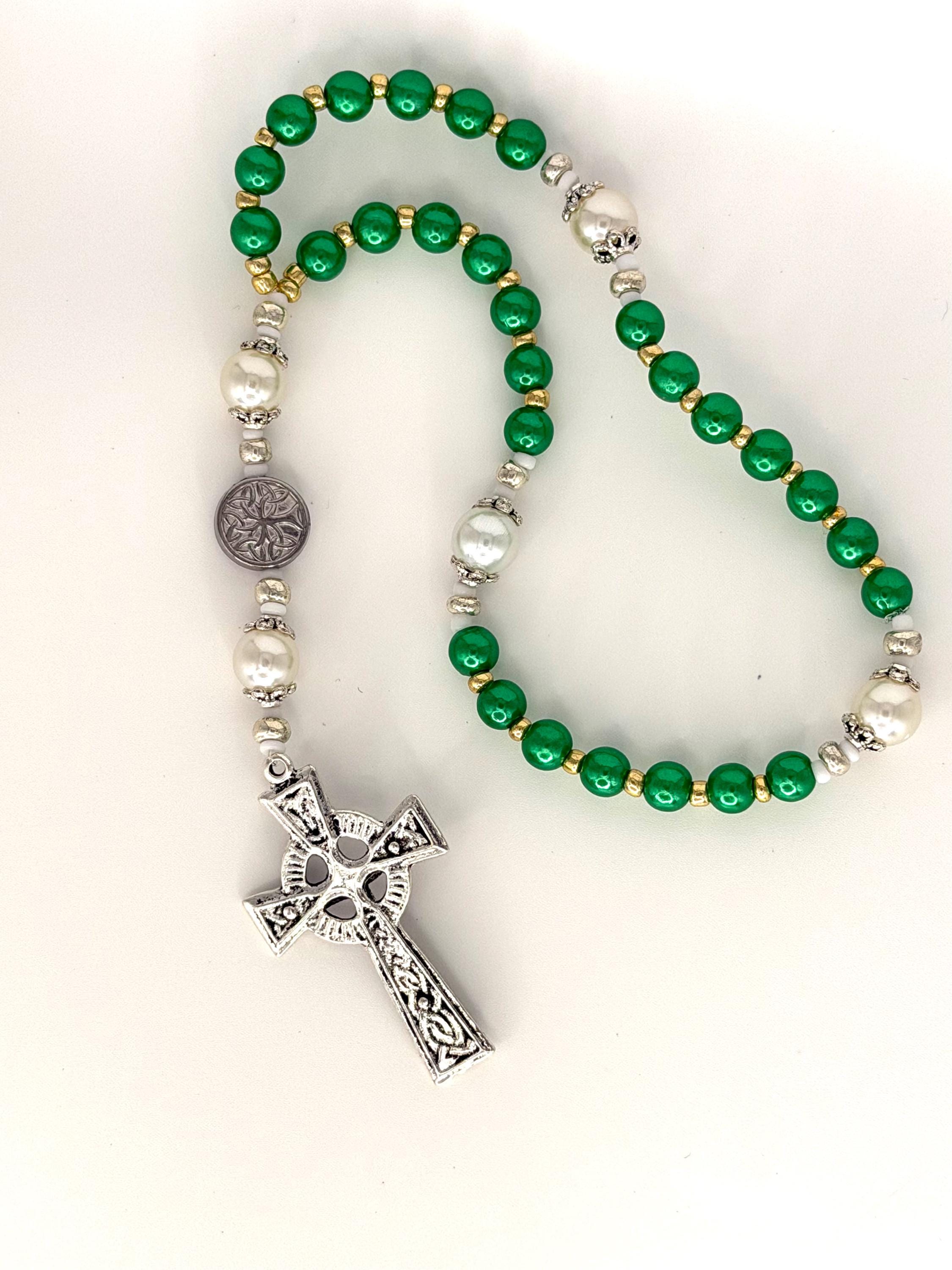 This handmade Celtic Anglican rosary features vibrant green beads, gold and silver accents, luminous pearl-style details, and an ornate silver-tone cross and a tree of life bead for added Celtic flavor. Crafted with care, this rosary is a beautiful devotional piece for prayer, meditation, or gift-giving.