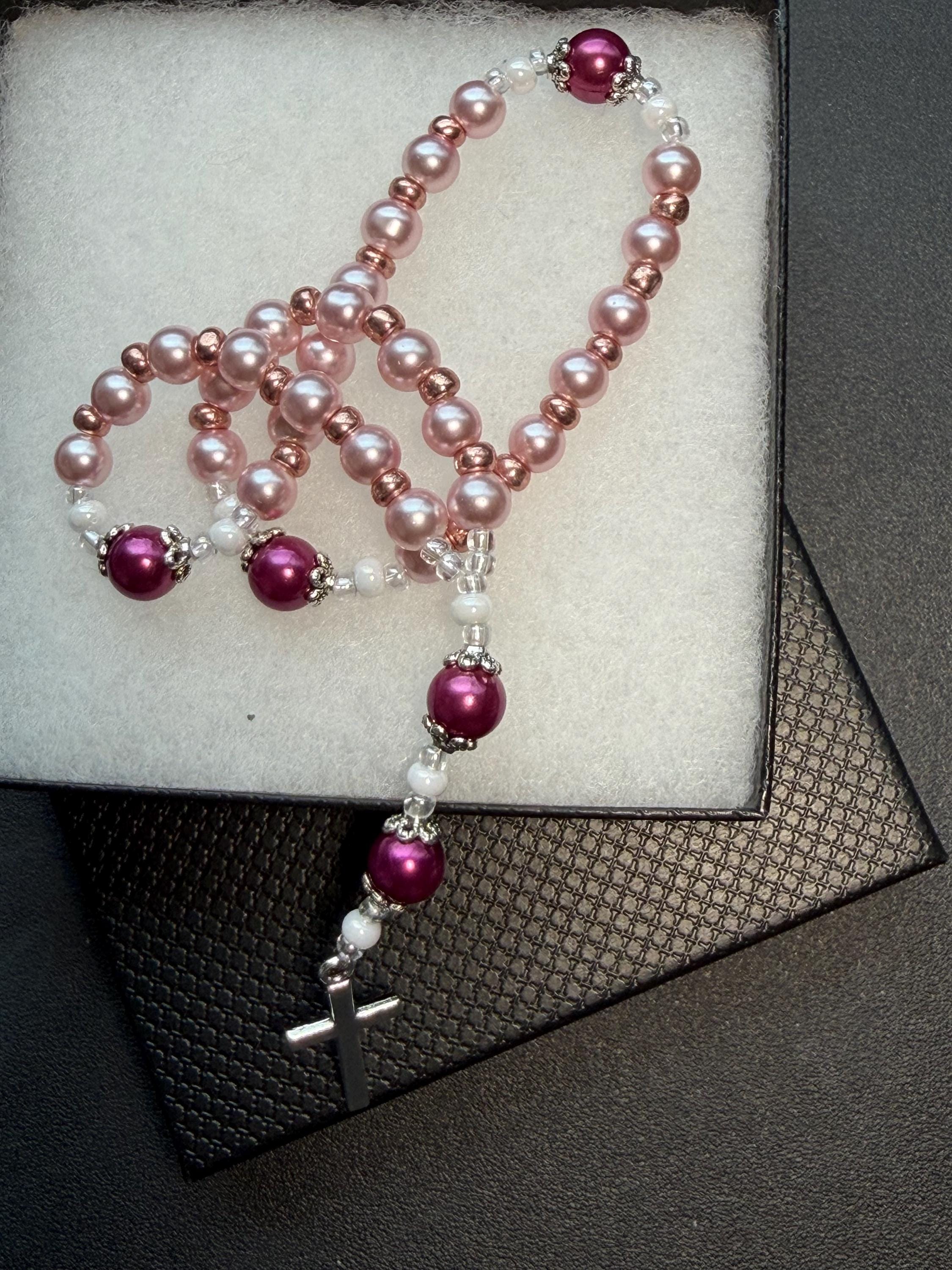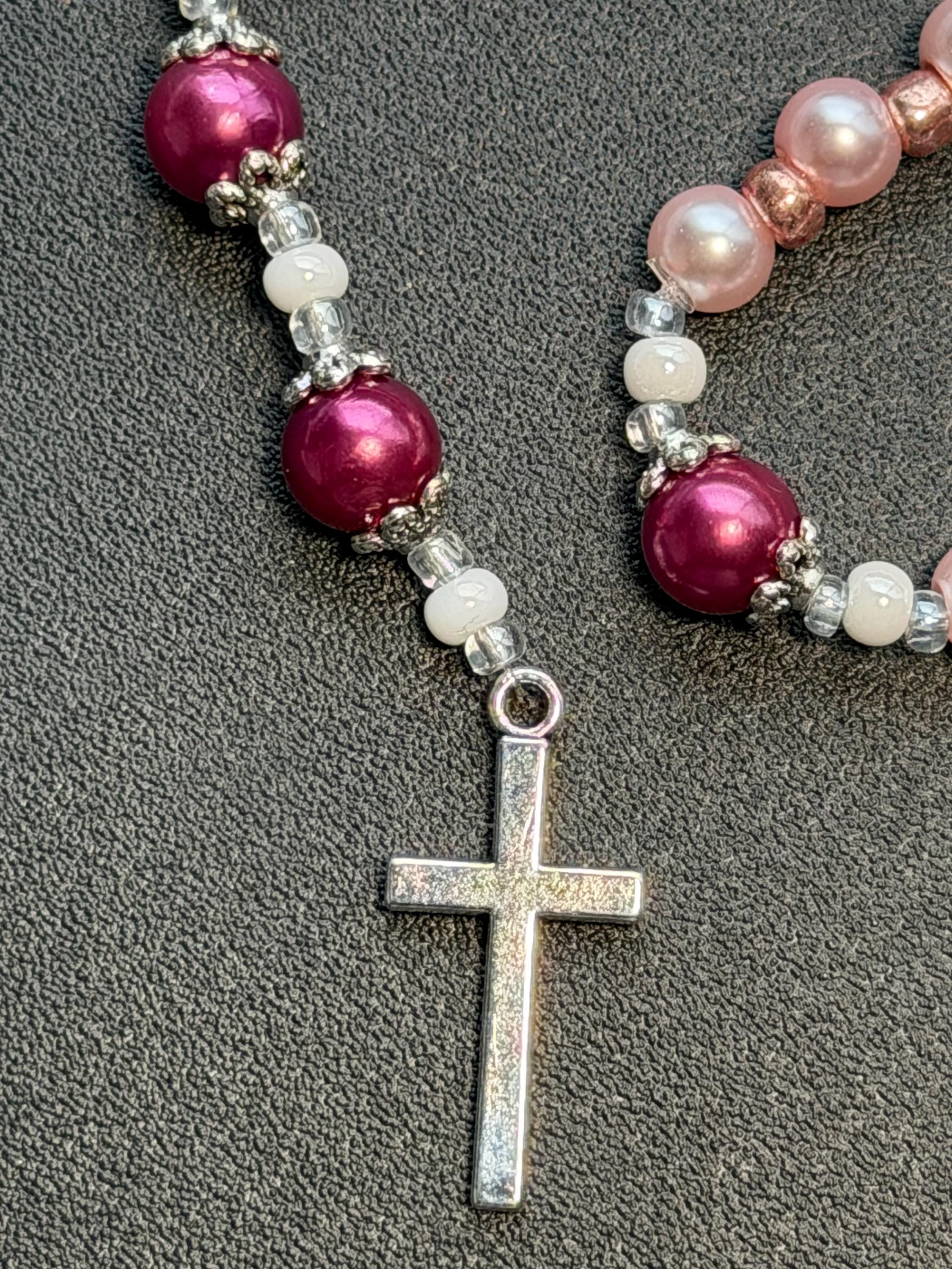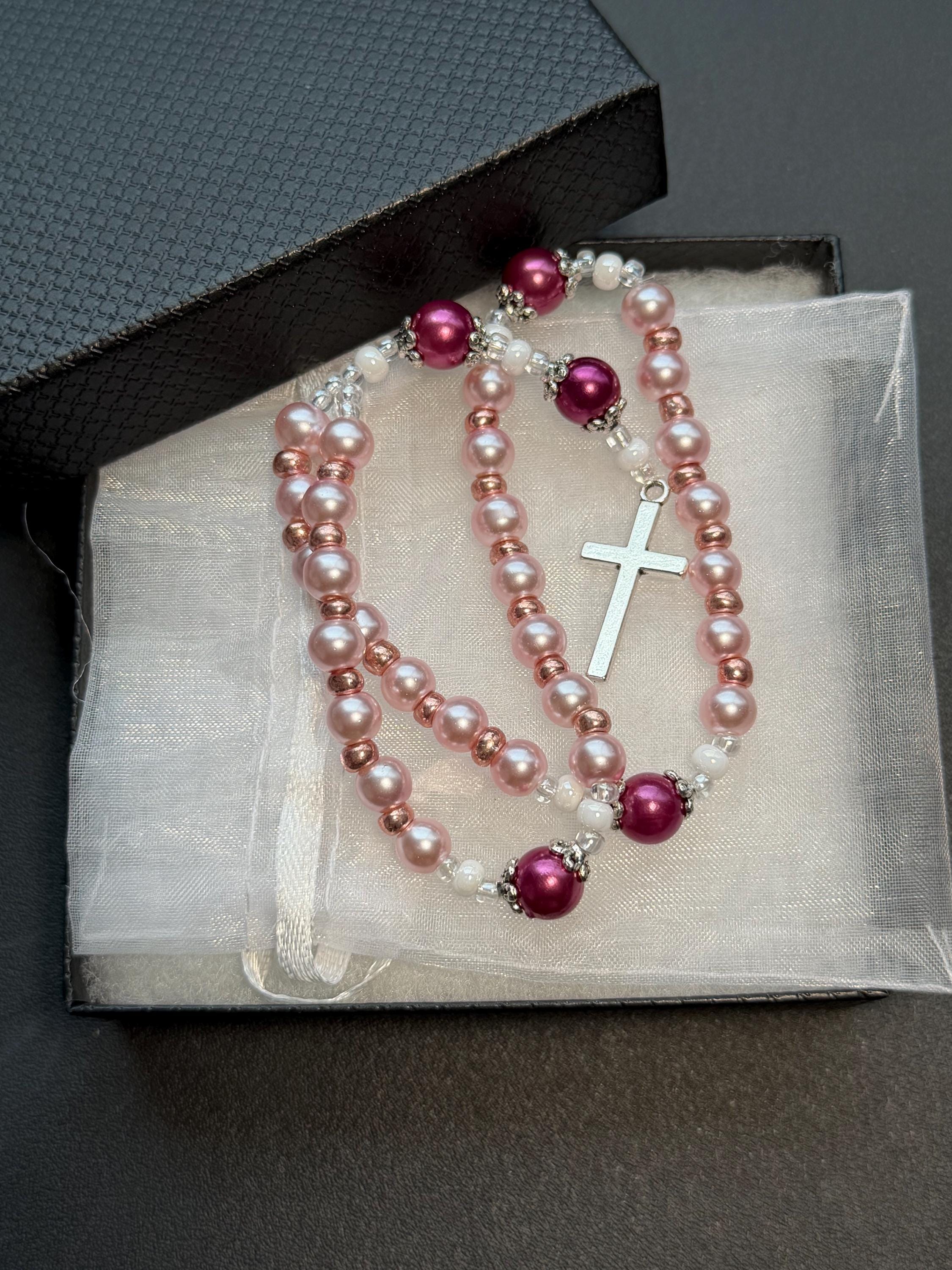 A feminine handmade Anglican rosary designed for prayer, reflection, and beauty. This rosary features soft pink pearl-style beads paired with rich magenta cruciform beads, rose gold spacers, white accent beads, and a simple silver cross for a graceful devotional finish.