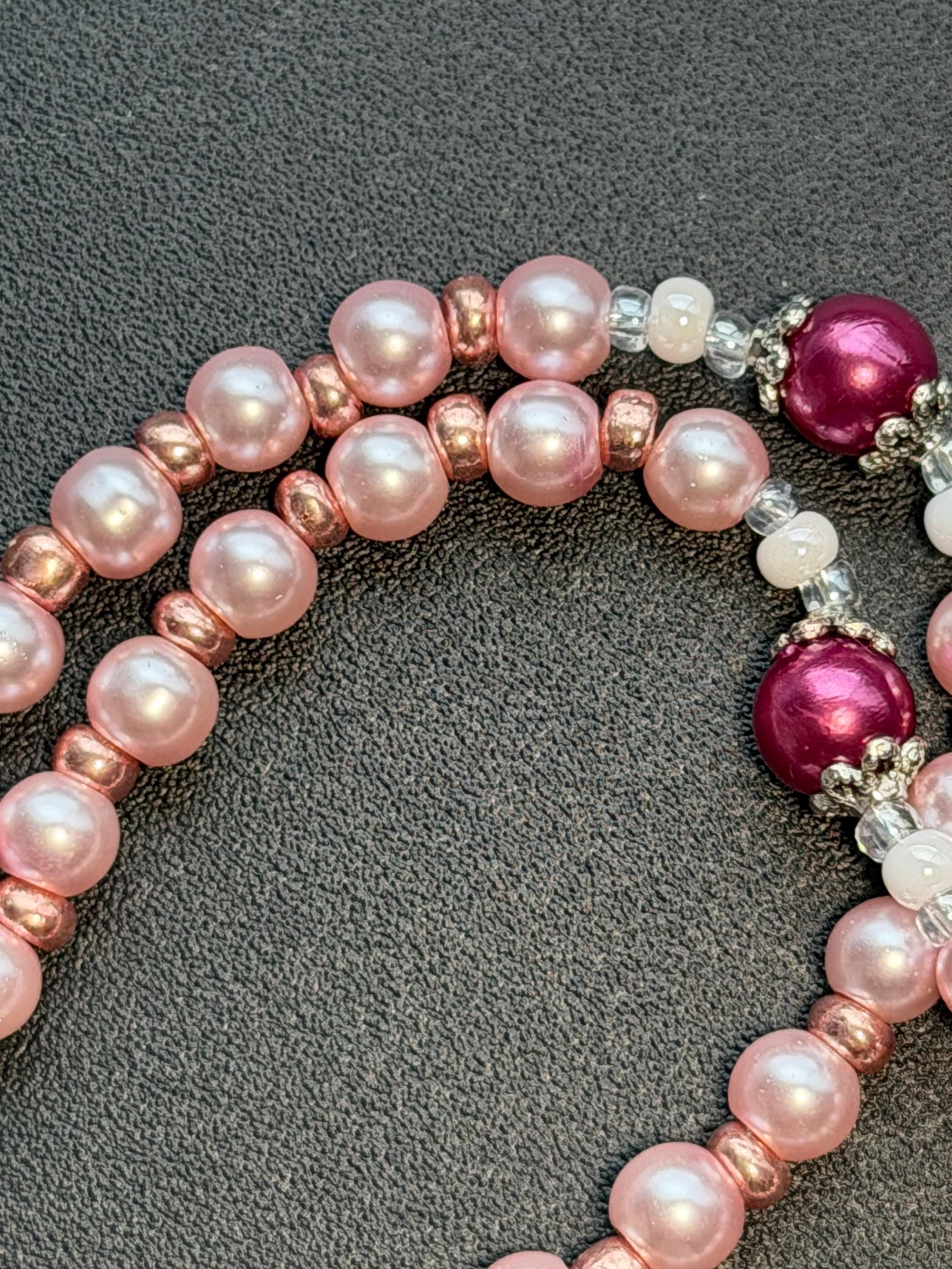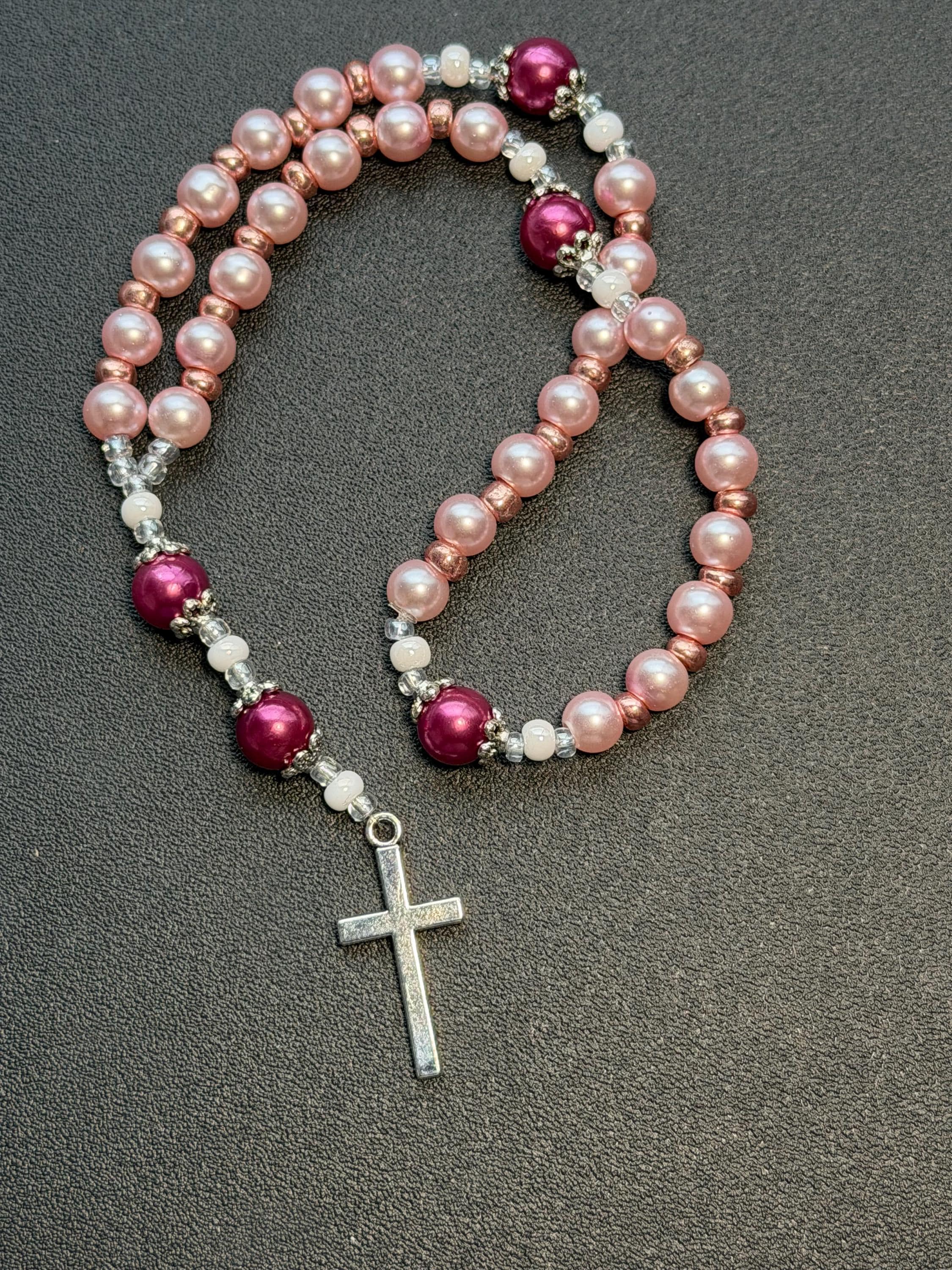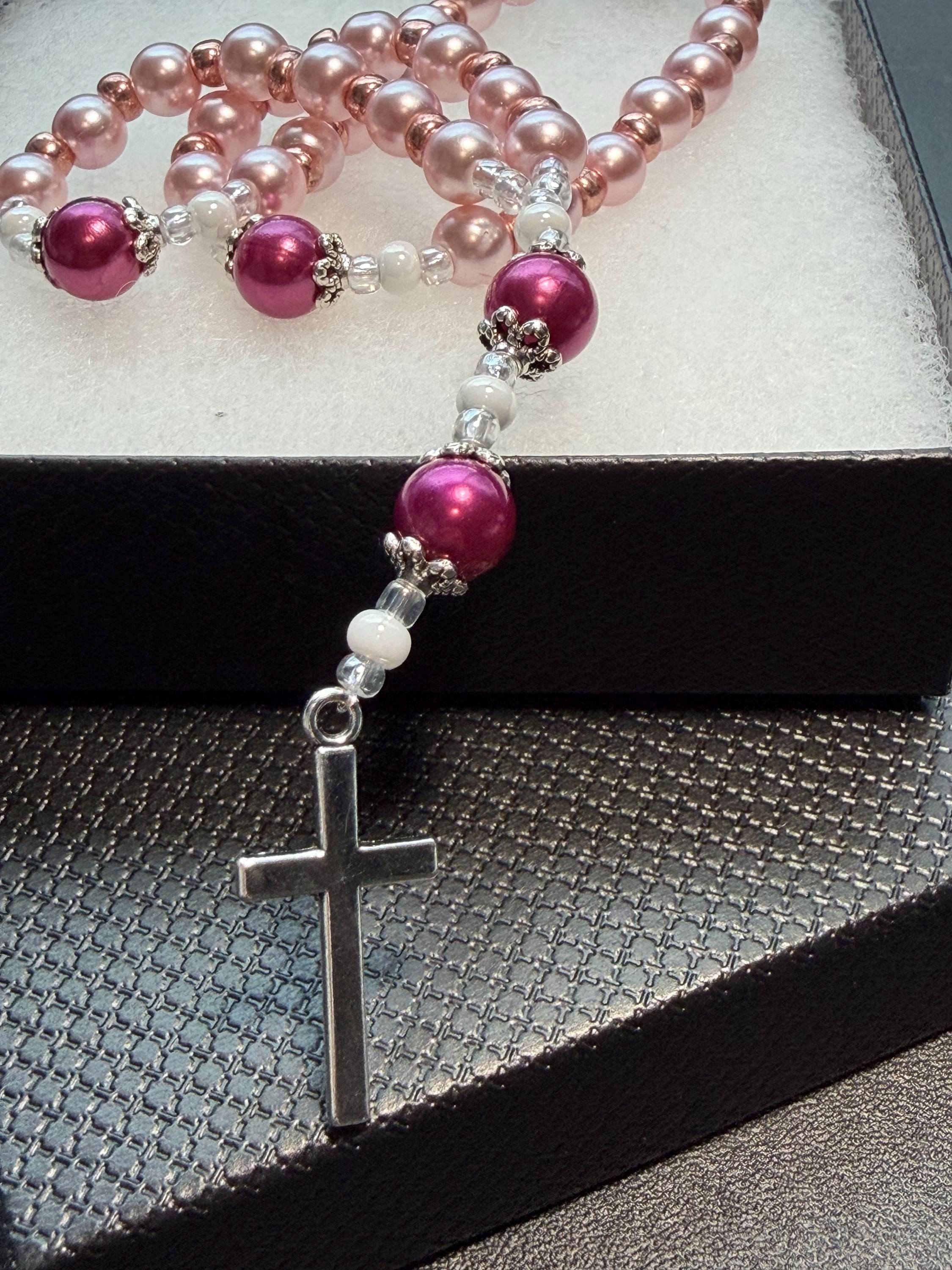 A feminine handmade Anglican rosary designed for prayer, reflection, and beauty. This rosary features soft pink pearl-style beads paired with rich magenta cruciform beads, rose gold spacers, white accent beads, and a simple silver cross for a graceful devotional finish.
