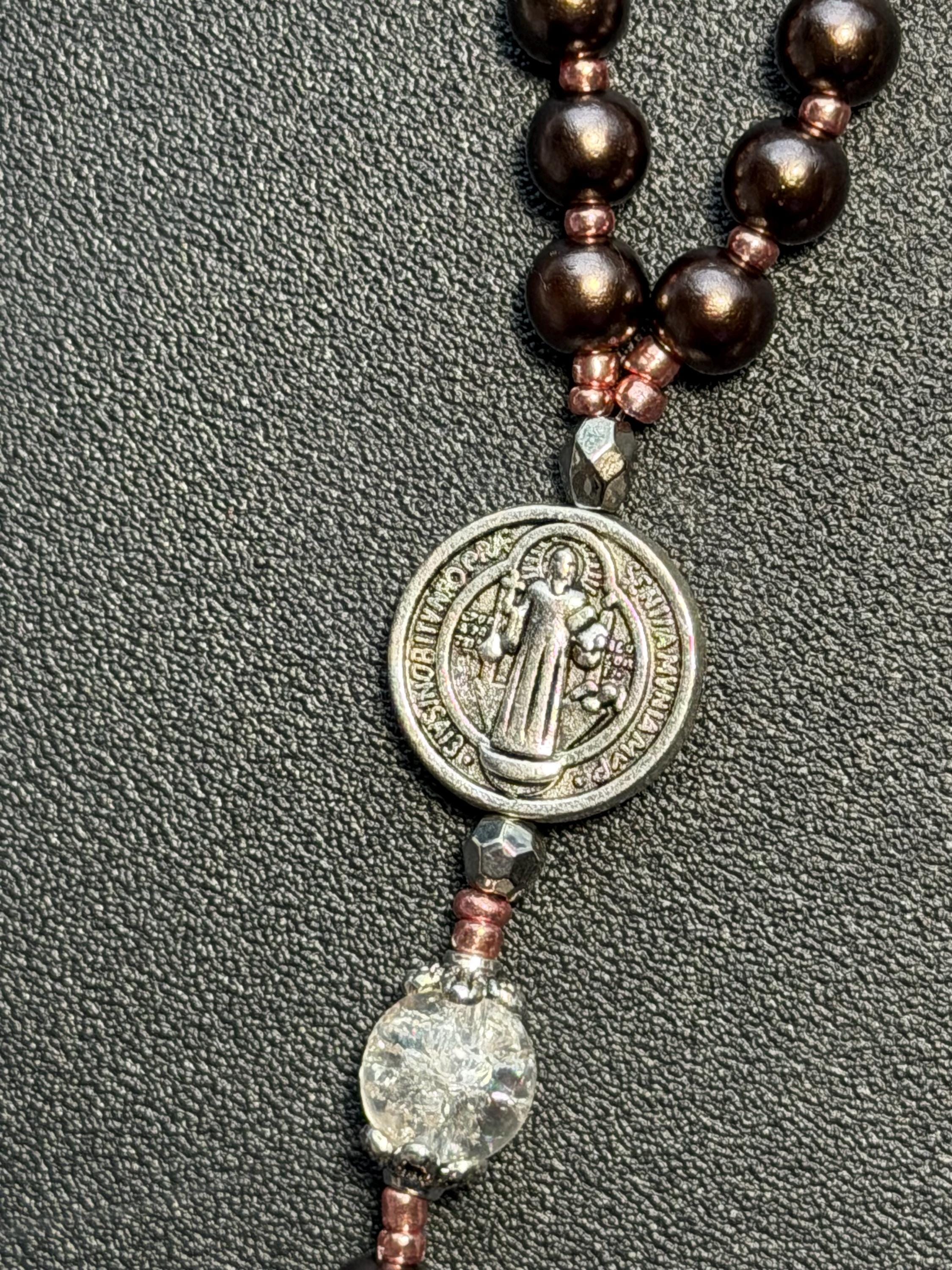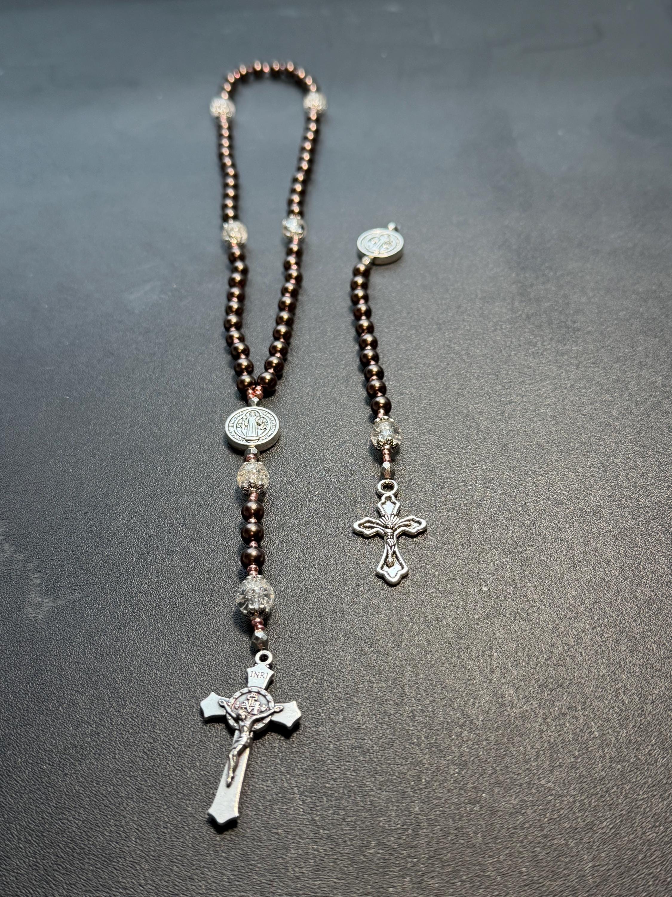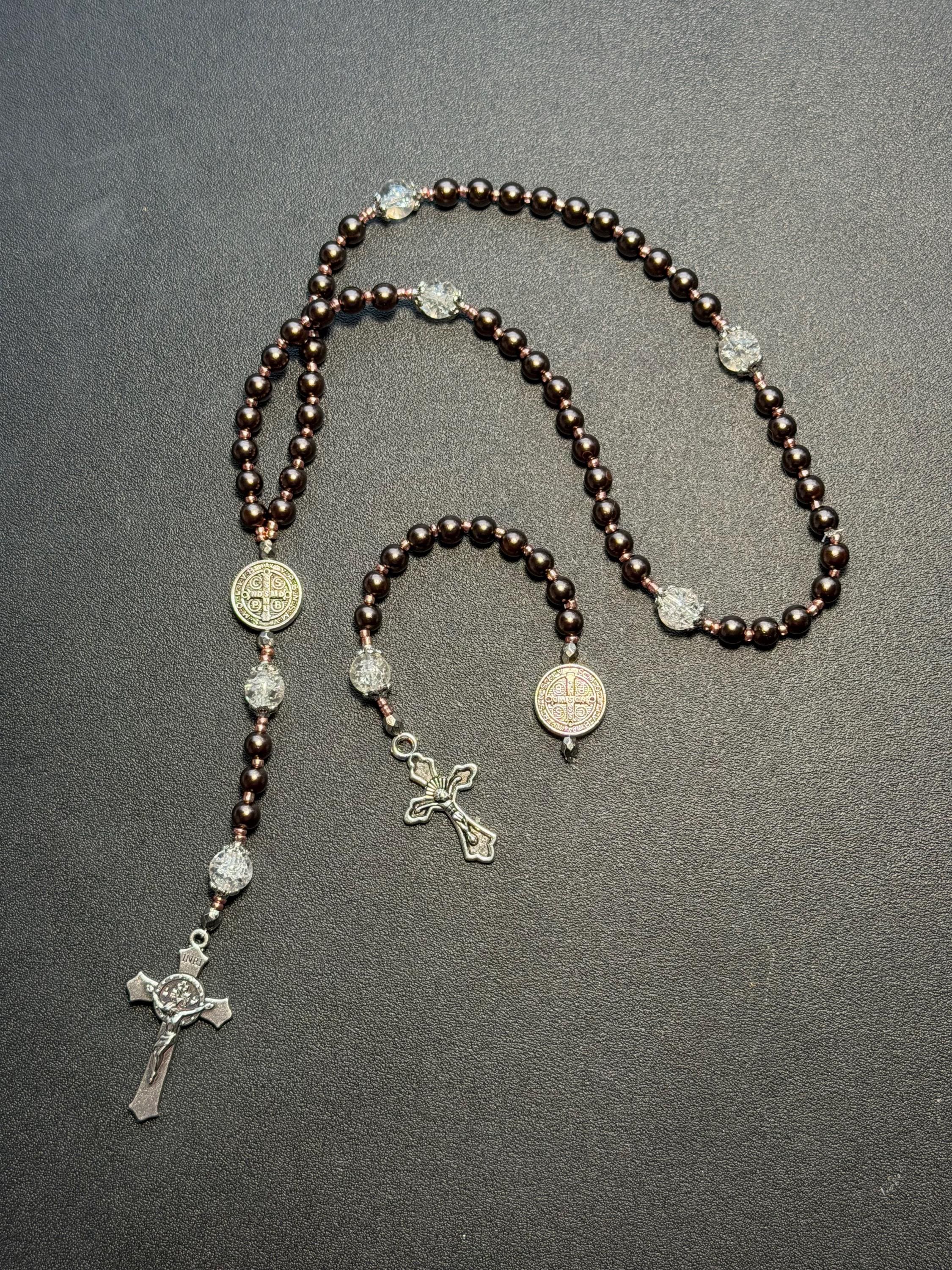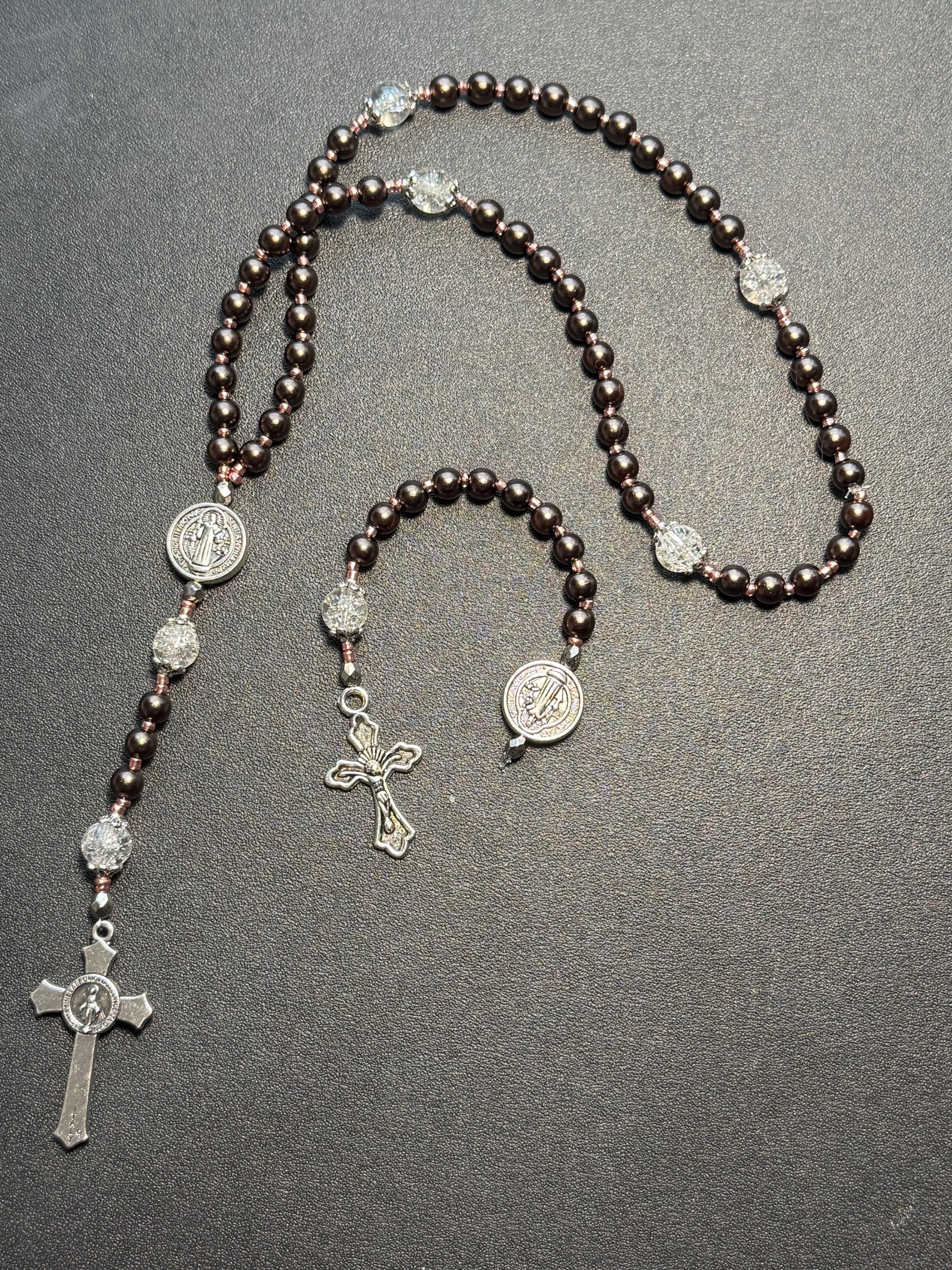 This handcrafted rosary set includes one full decade rosary and one matching single decade pocket rosary, designed in a warm bronze-brown color palette with rose gold spacers and St. Benedict beads.