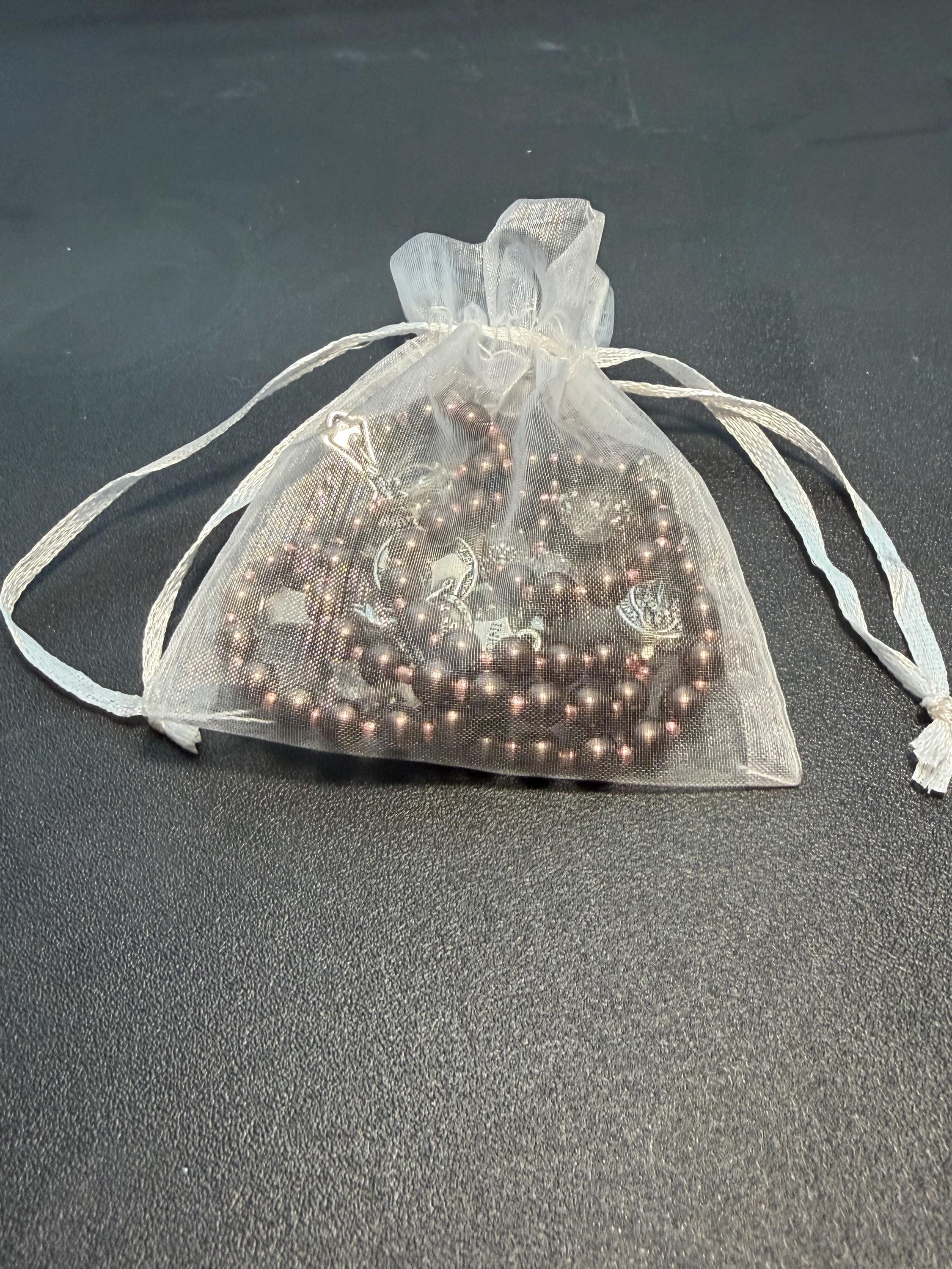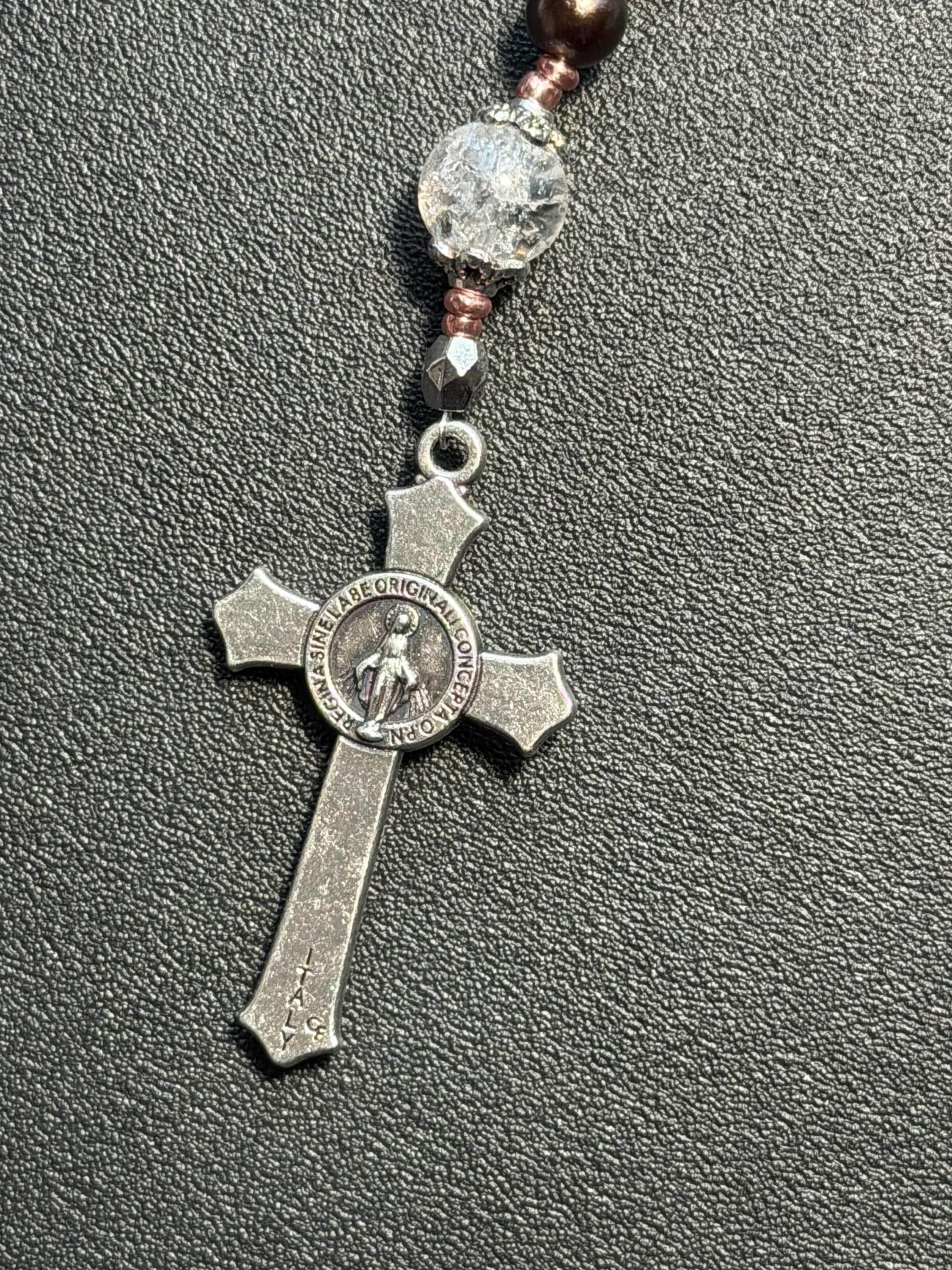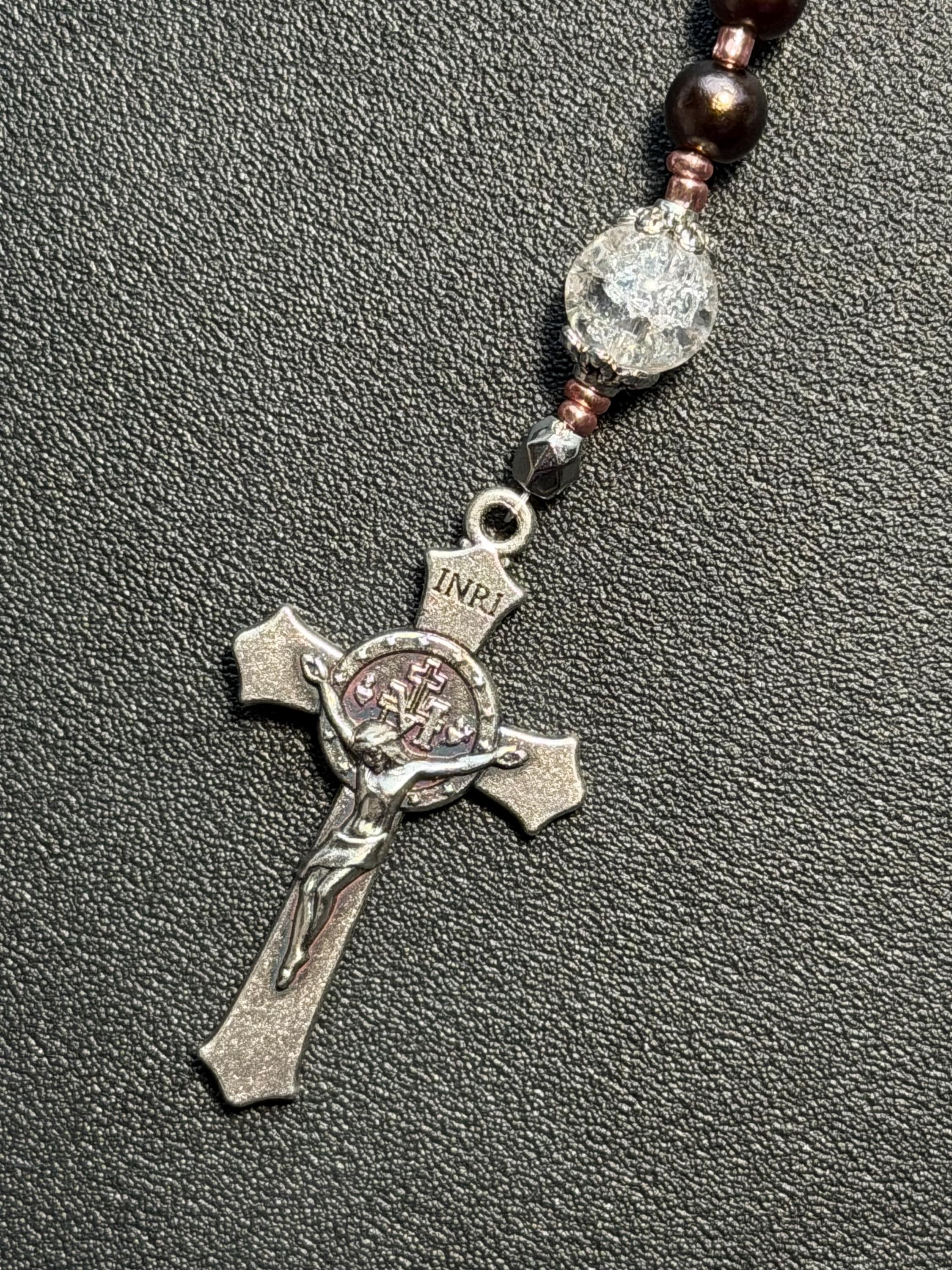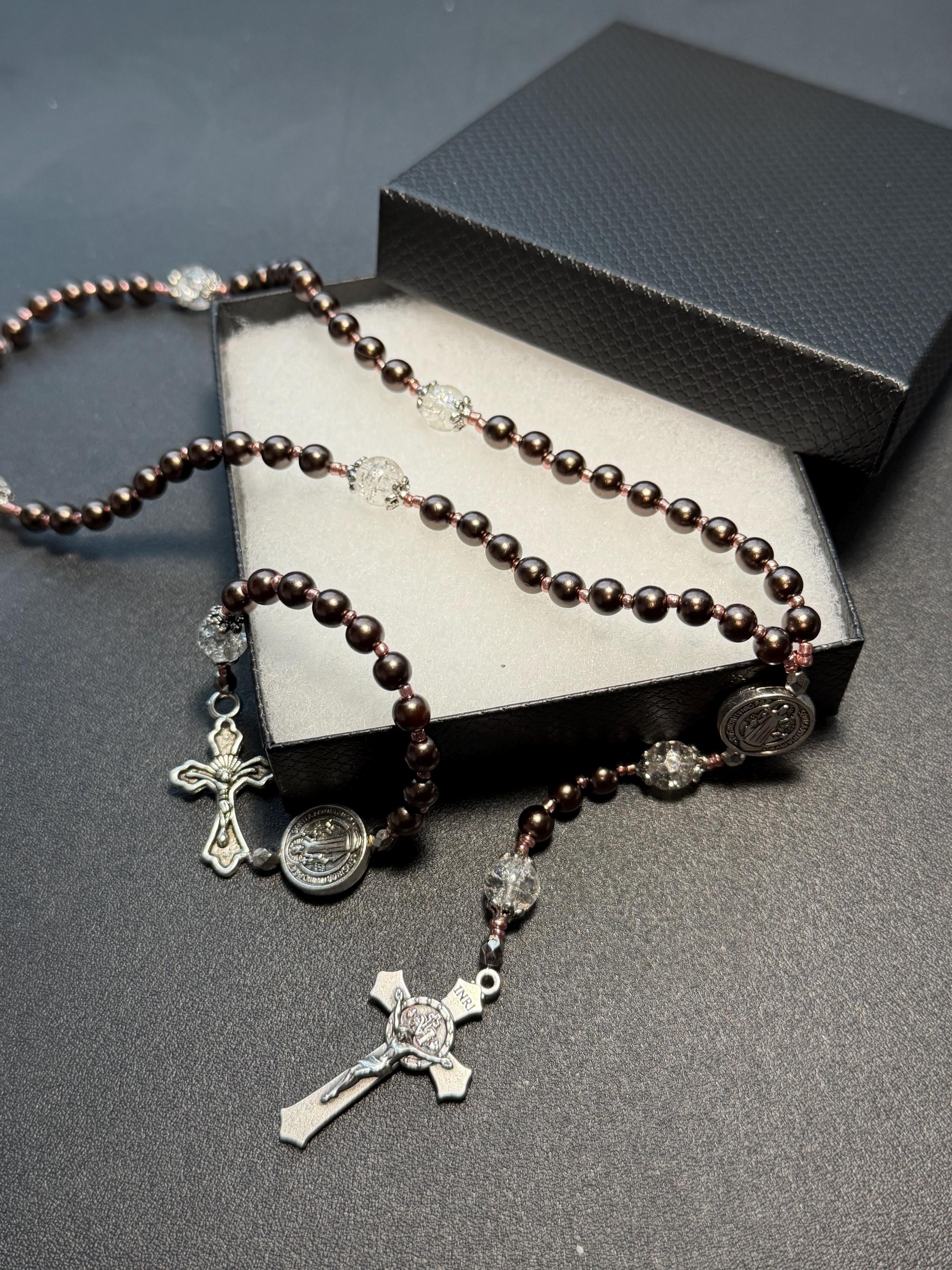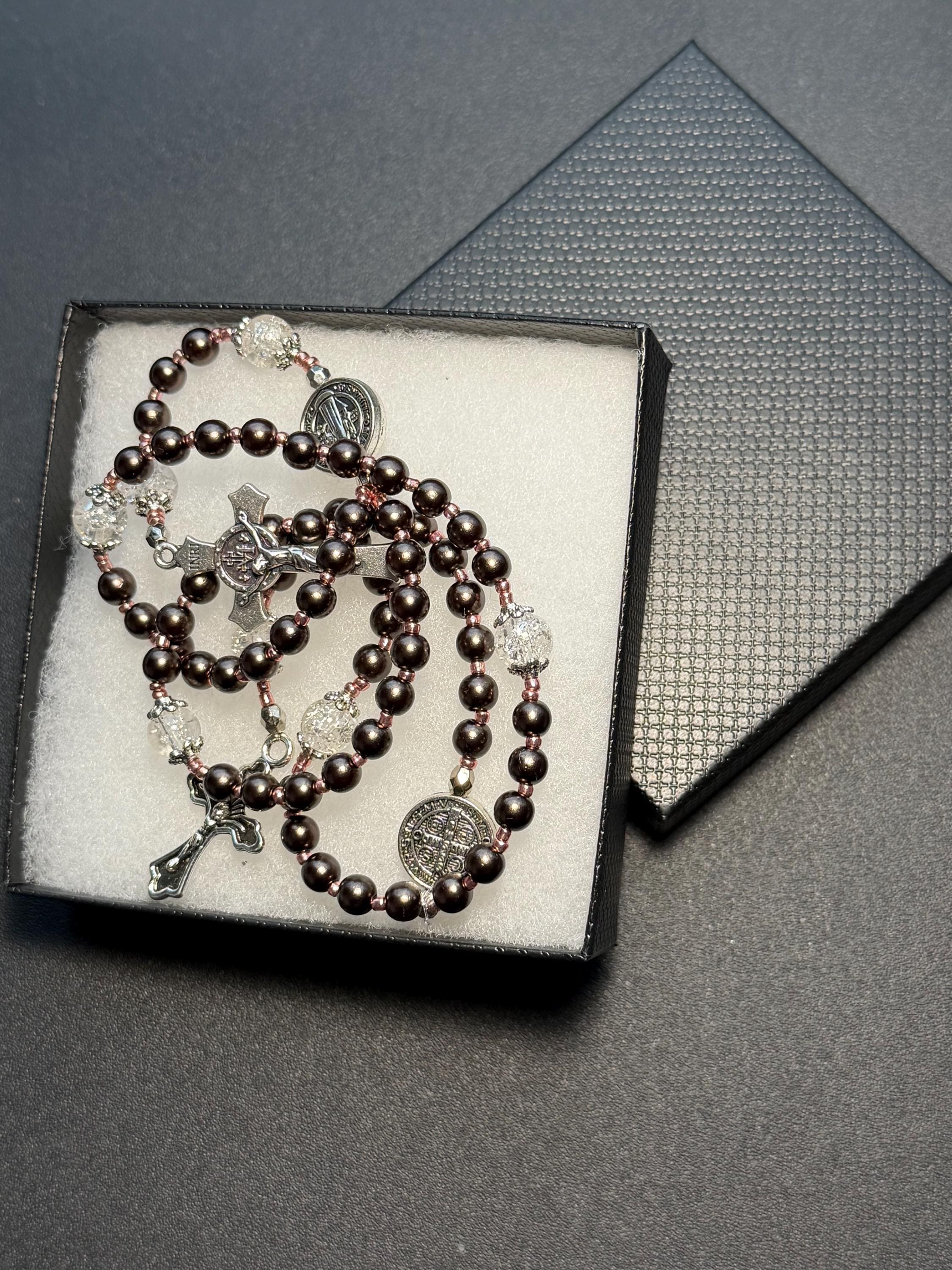 This handcrafted rosary set includes one full decade rosary and one matching single decade pocket rosary, designed in a warm bronze-brown color palette with rose gold spacers and St. Benedict beads.